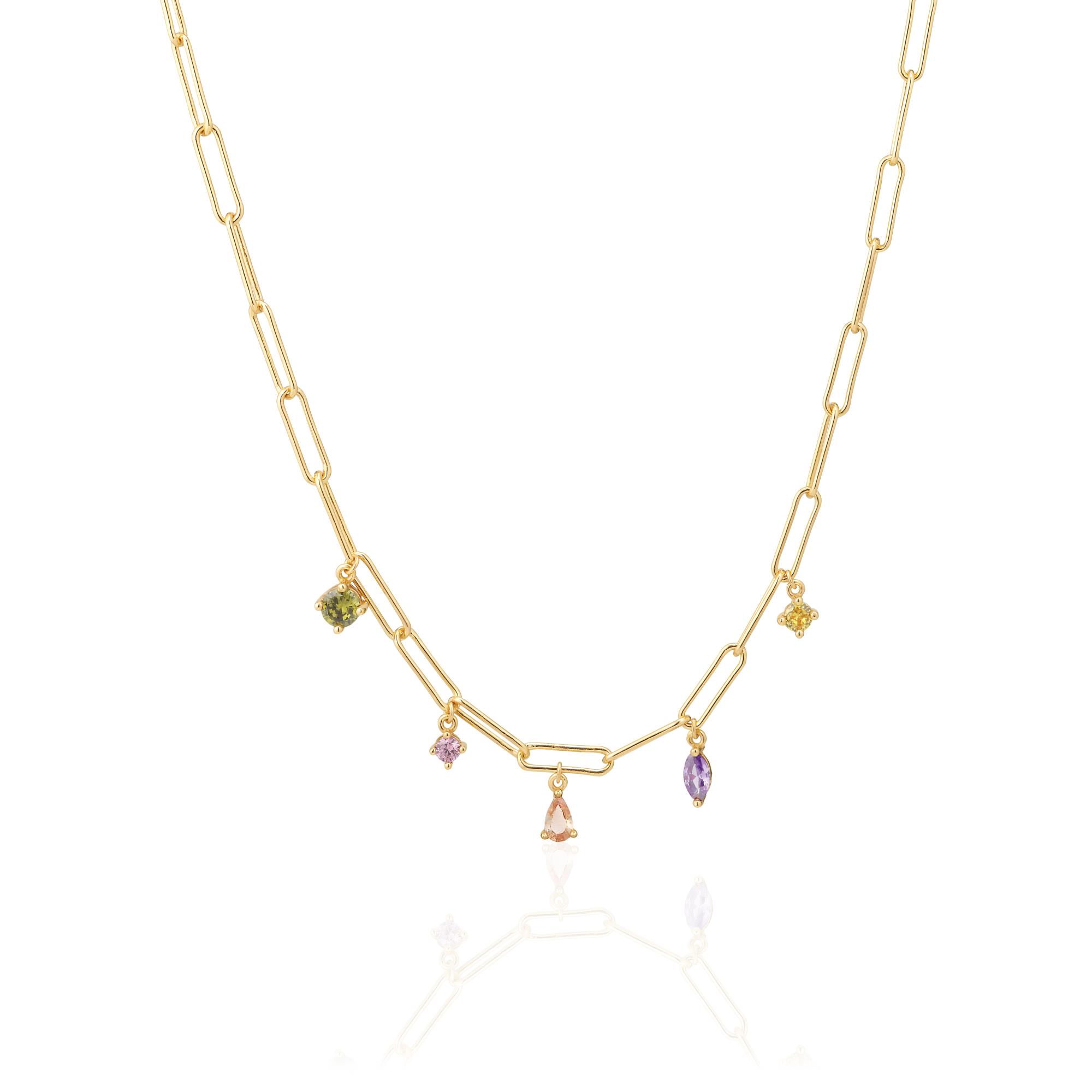 Collier van 925 Sterling zilver met gold plated 18 karaat goud laag, oppervlak glanzend. Versierd met handset veelkleurige druppel, marquise en ronde zirkonia.